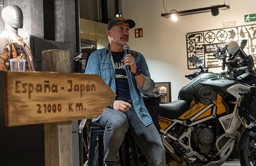 Julio Álamo ha desgranado las claves de su vuelta al mundo en moto durante una charla–coloquio celebrada en Triumph Madrid, el espacio elegido para acoger un encuentro que ha reunido a decenas de aficionados al mototurismo y los viajes en moto.Un foro abierto en el que los asistentes pudieron conocer de primera mano el testimonio del viajero, una aventura marcada por la adaptación constante y la toma de decisiones en tiempo real, y en la que puso el acento en cómo un viaje de largo recorrido puede transformarse cuando se confía plenamente en la moto y en la experiencia acumulada en ruta.
