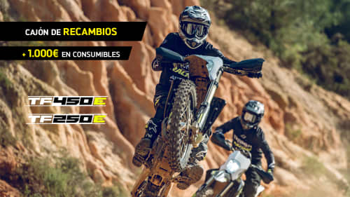 Como sabemos que cuando pruebes la moto te va a gustar, pero necesitas un plus de confianza en tu decisión, hasta el 30 de junio tienes la oportunidad de estrenar una Triumph TF 250-E o TF 450-E con un cajón de recambios de regalo valorado en 1.000€ para que nada pare tus planes y aventuras.